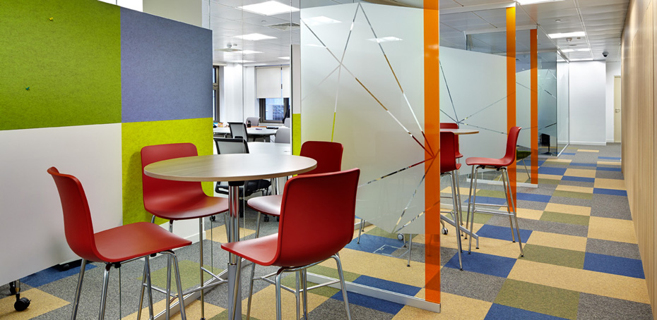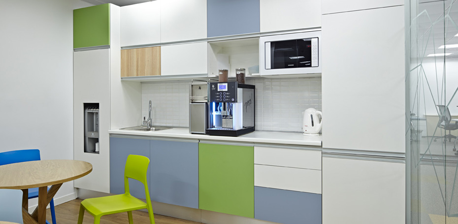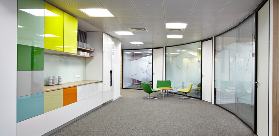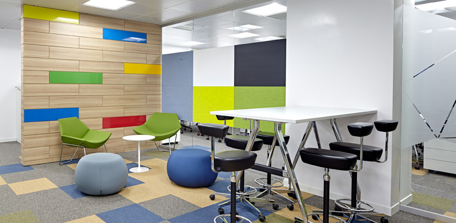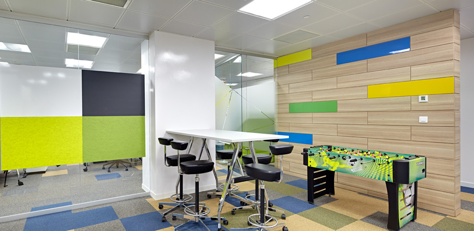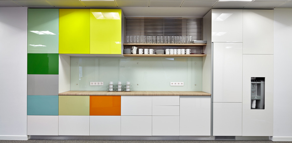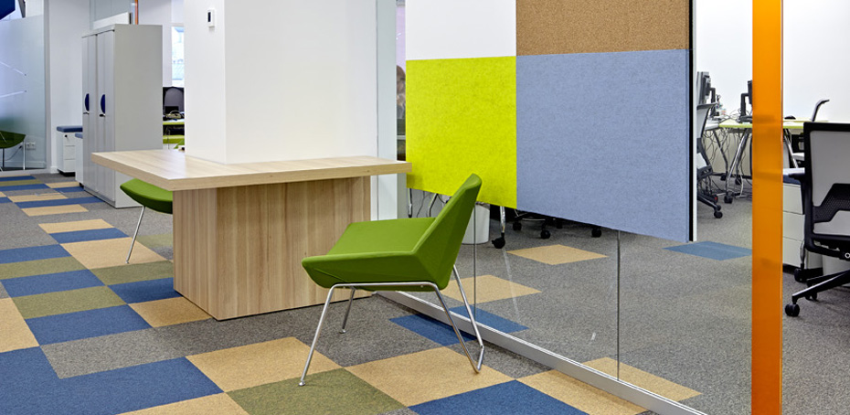 Особое внимание уделено отдыху и общению. По всей зоне офиса располагается множество уютных столиков, стоек и мягких кресел. Есть отдельная кухня и открытый кофе-поинт в холле офиса, где каждый может сделать себе горячий напиток. Все шкафы, полки и столы изготовлены на производстве ЛЕПОТА. Декоративные панели выполнены из войлока и пробки. |
