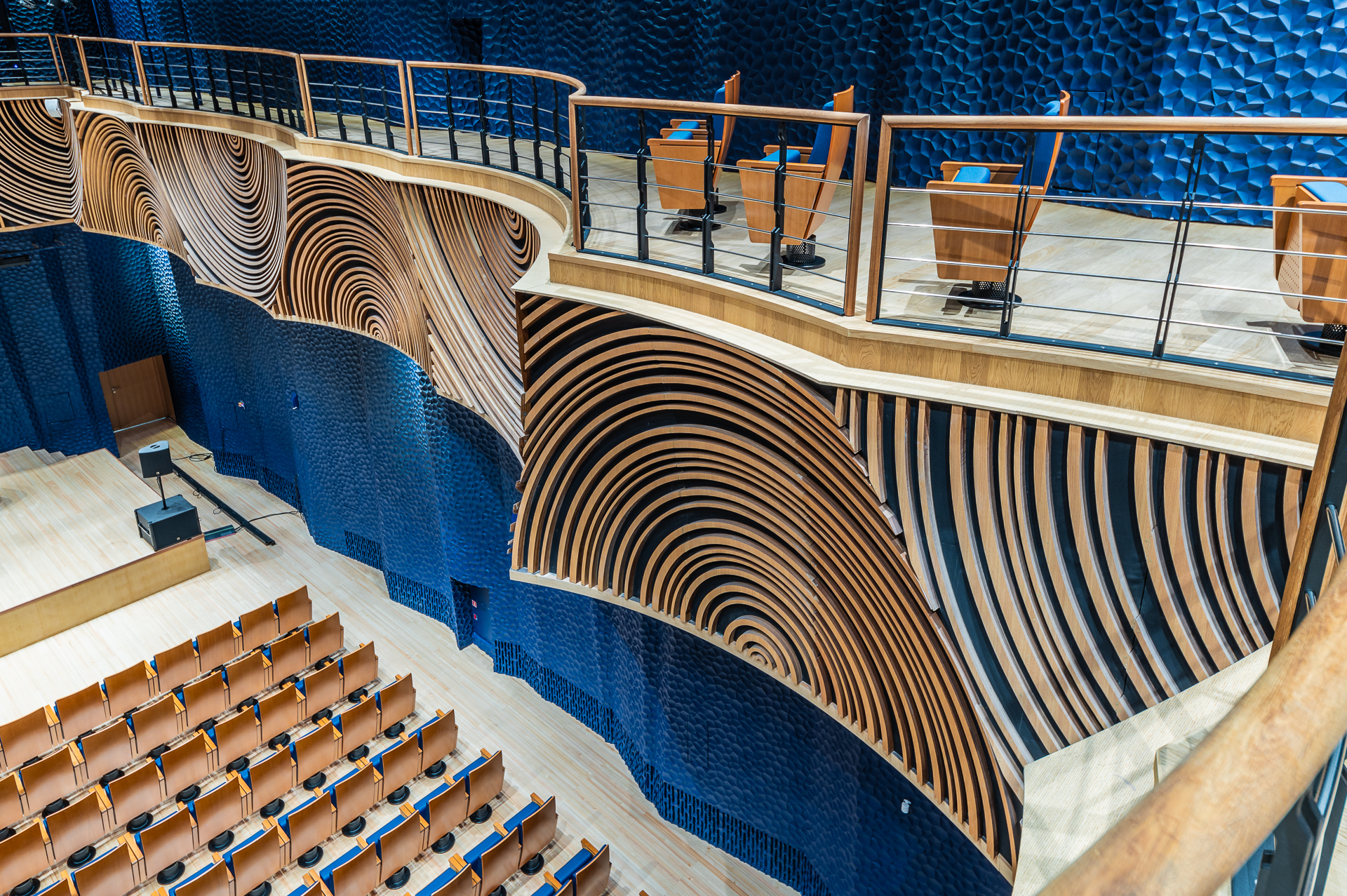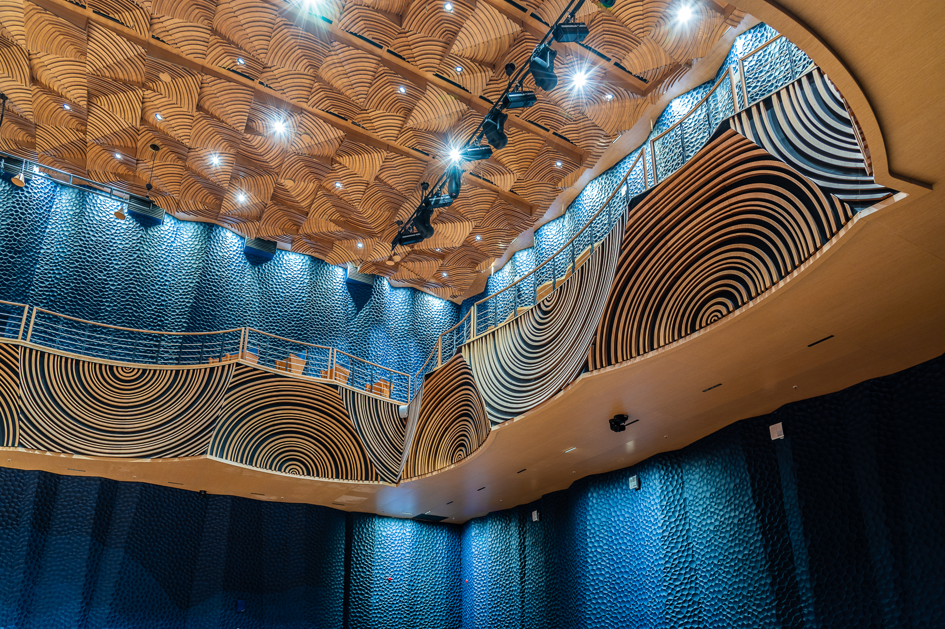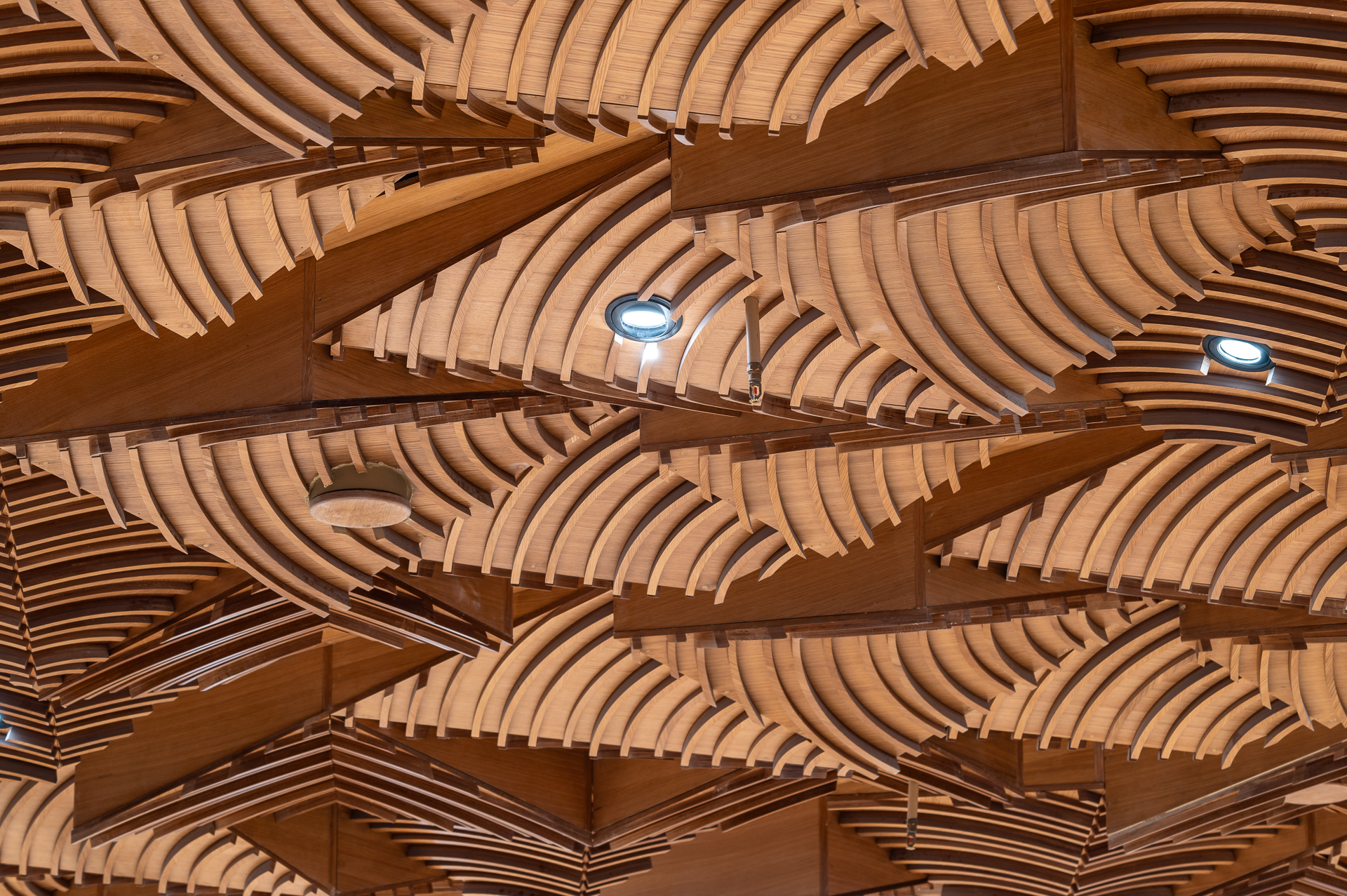 Эти слова как нельзя лучше объясняют, почему в интерьере нет прямых линий. Плавные сферы Камерного зала — это отсылка к предгорьям и холмам. Нам выпала честь переложить эту поэзию на язык дерева.