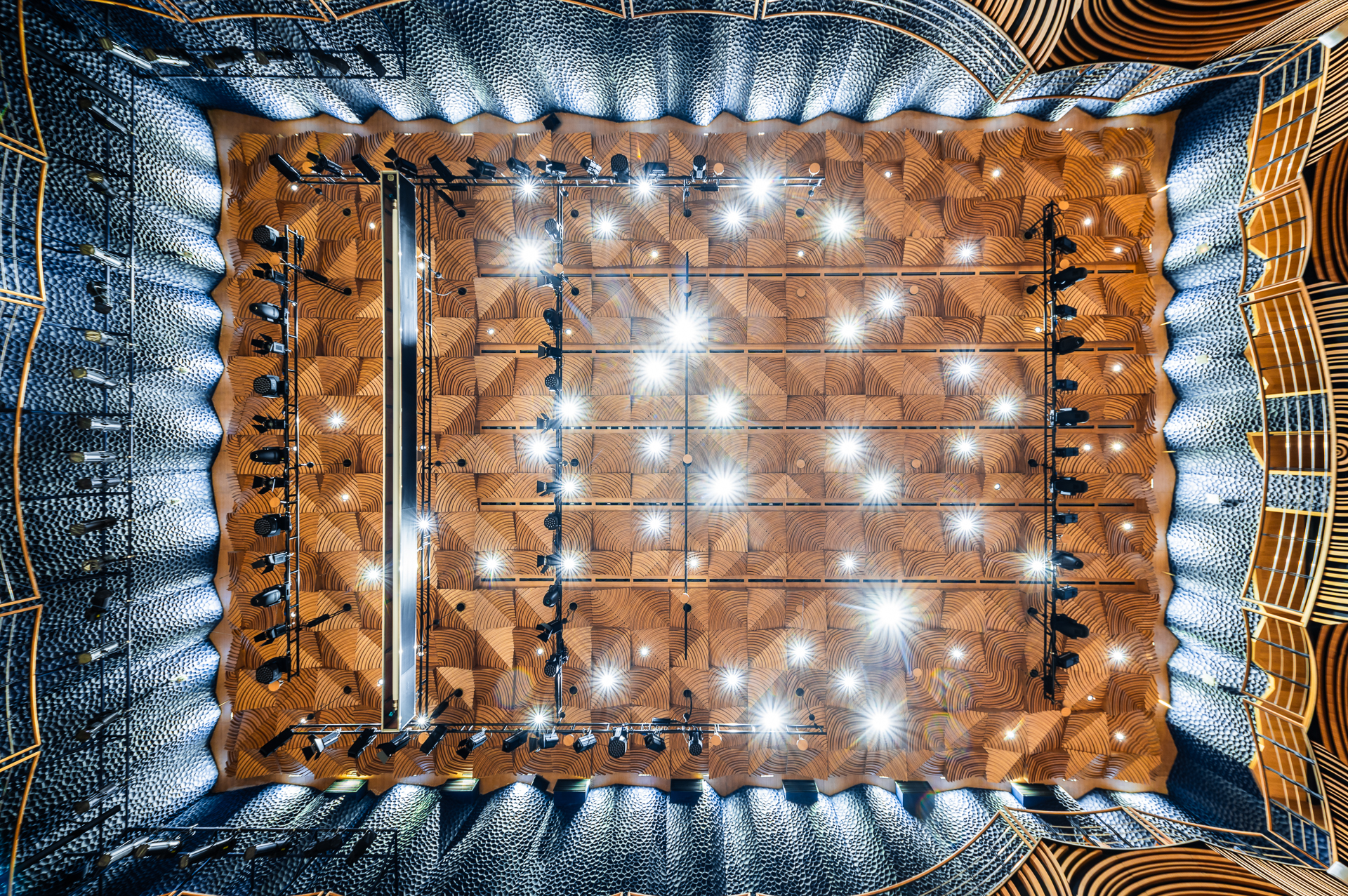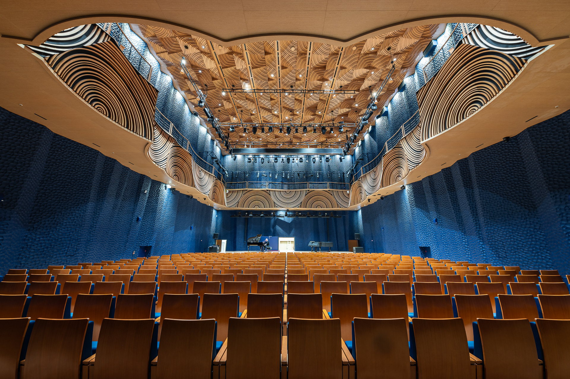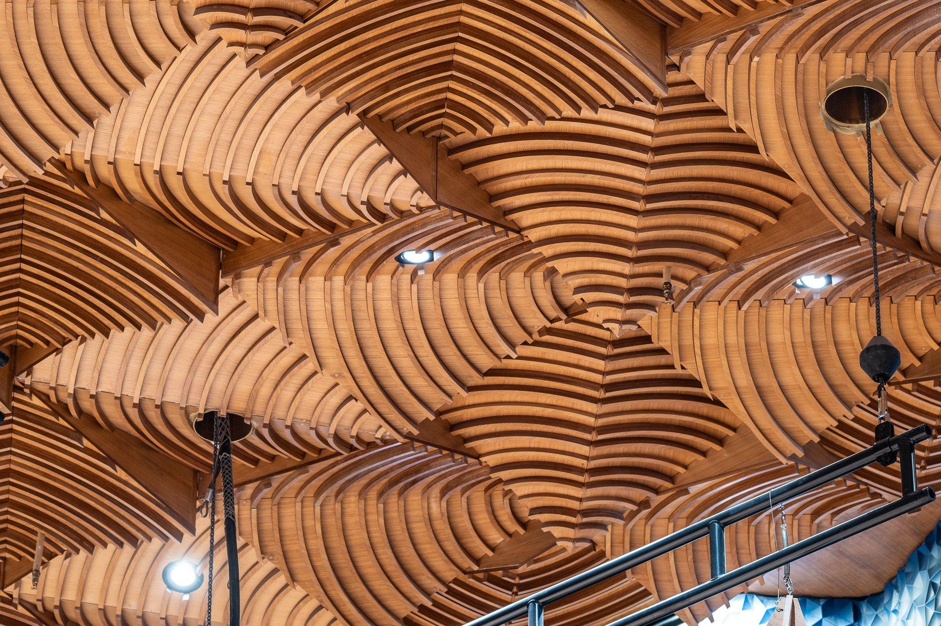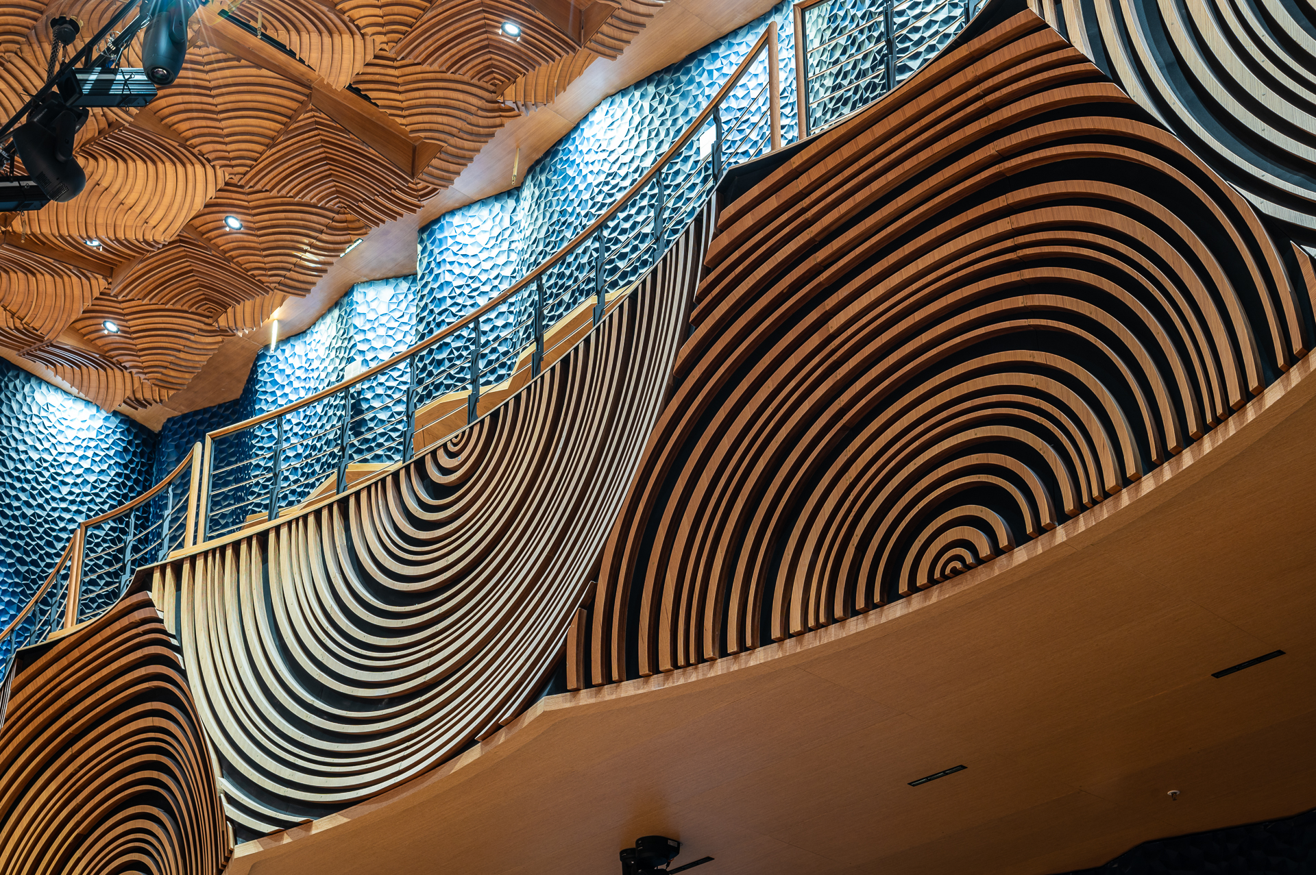 Эти слова как нельзя лучше объясняют, почему в интерьере нет прямых линий. Плавные сферы Камерного зала — это отсылка к предгорьям и холмам. Нам выпала честь переложить эту поэзию на язык дерева.