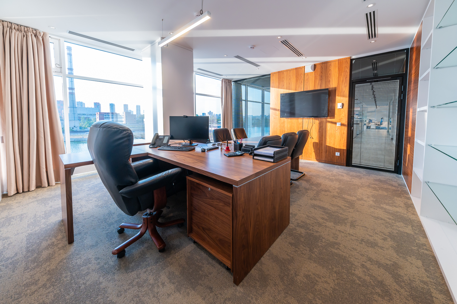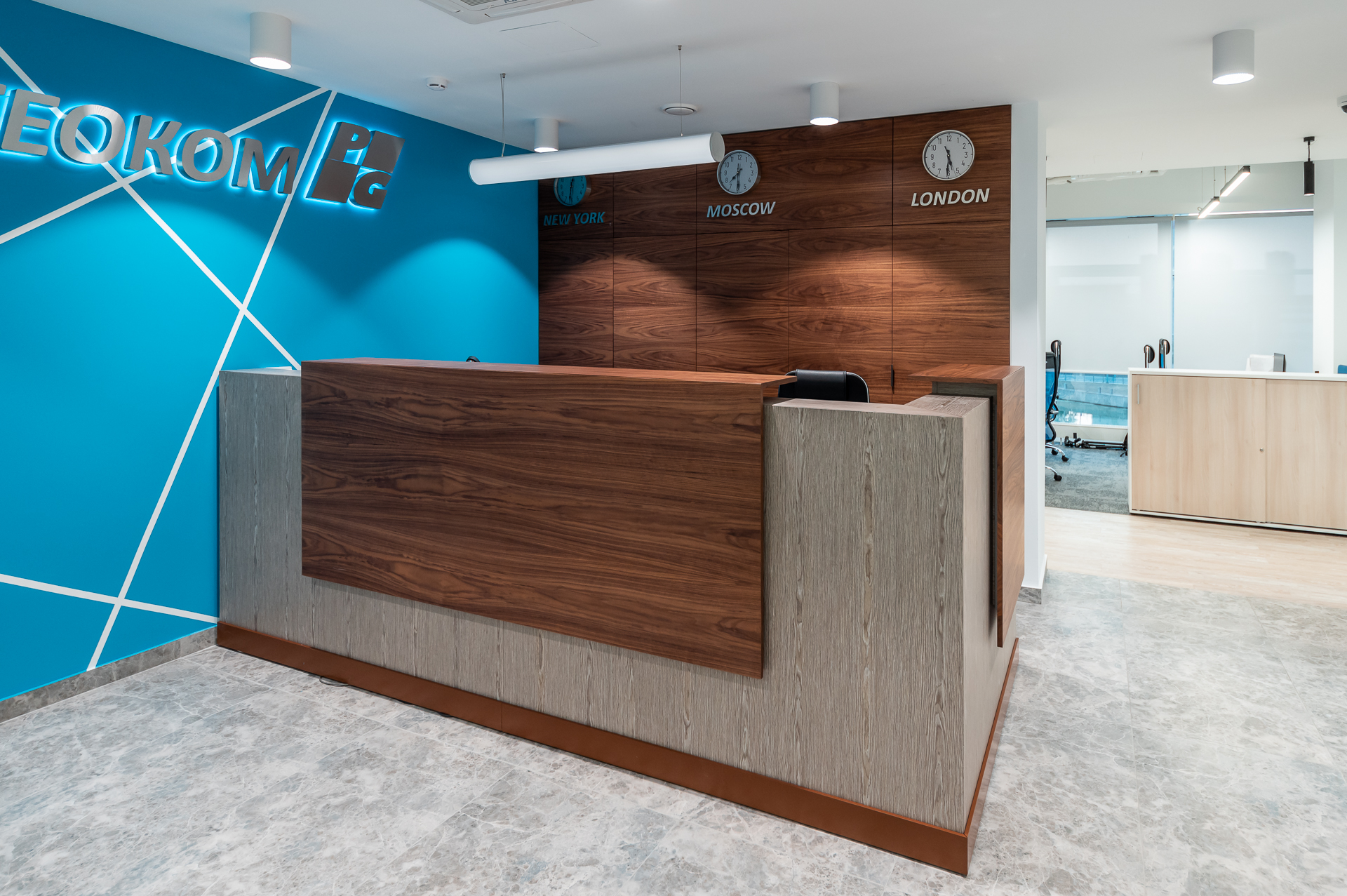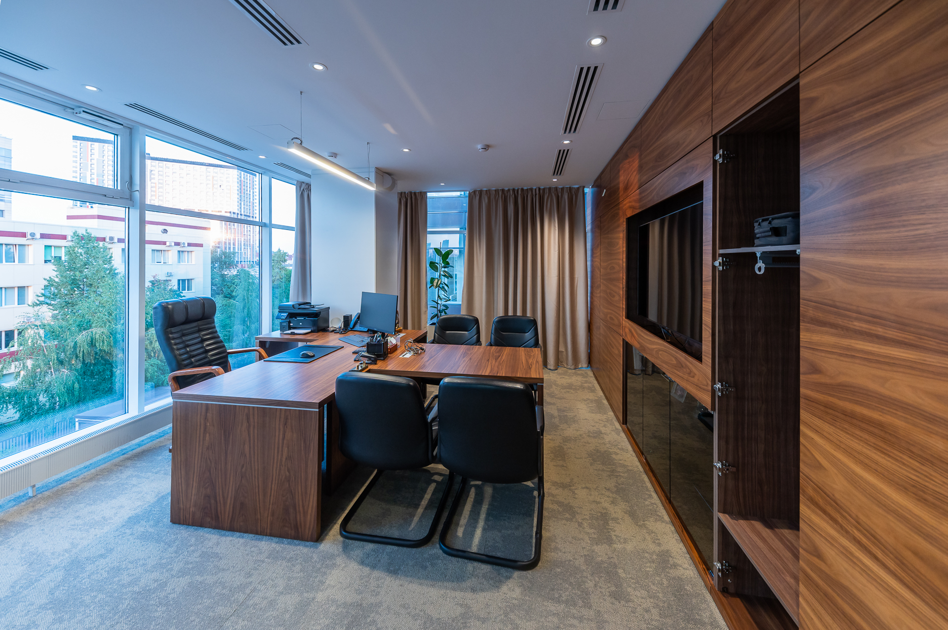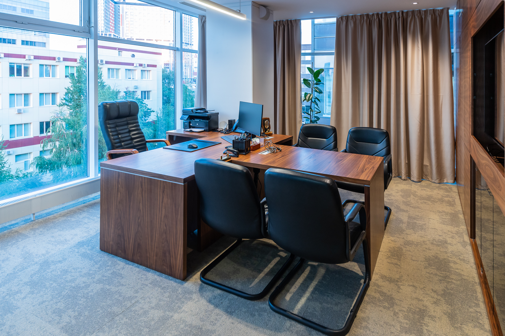 Для оснащения офиса была использована как серийная, так и индивидуальная мебель. Чтобы создать индивидуальное и удобное пространство наши специалисты разработали и производили мебель для кабинетов директоров, переговорных и рабочих зон, мебель и столы для зоны кухни.