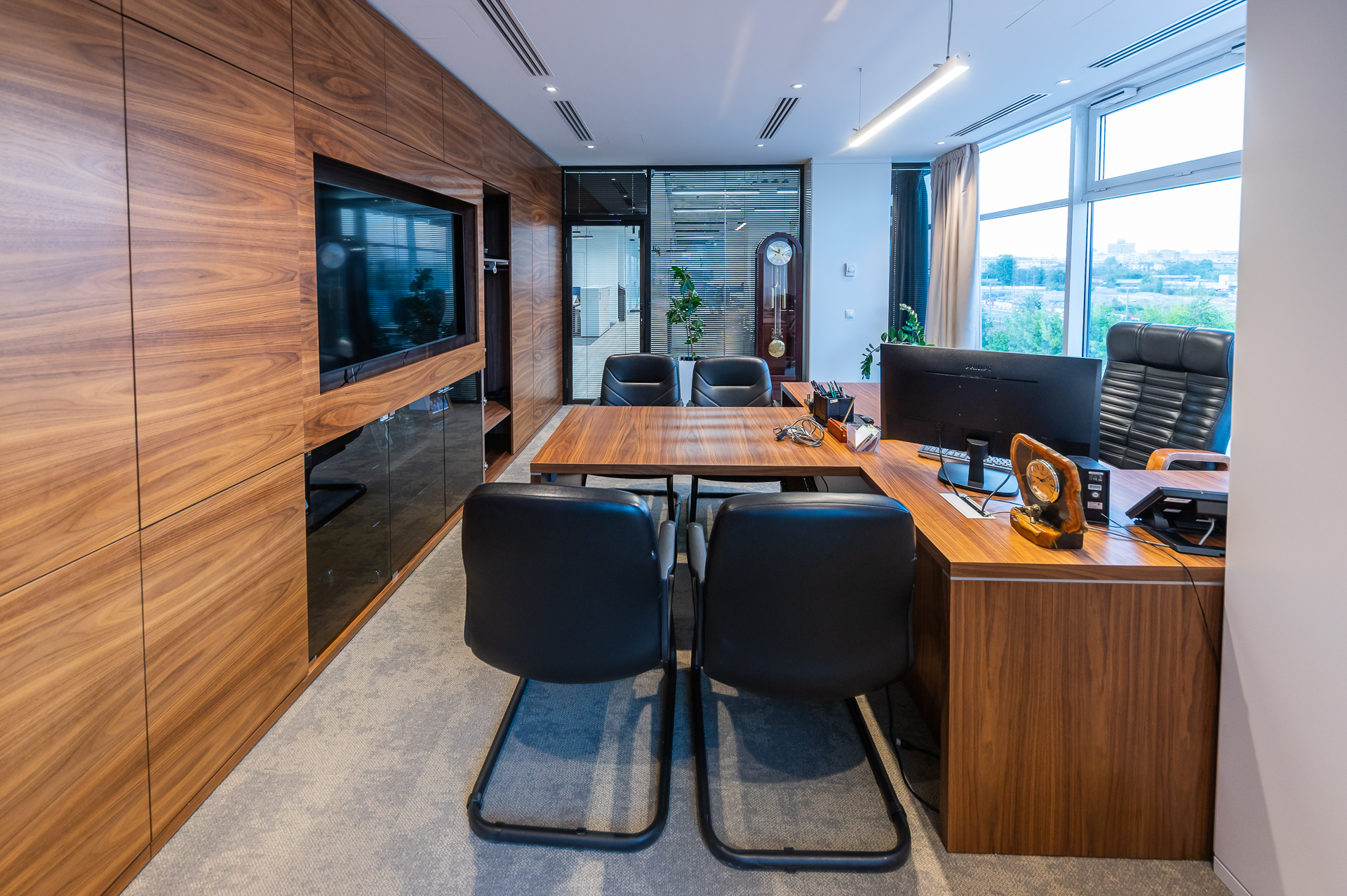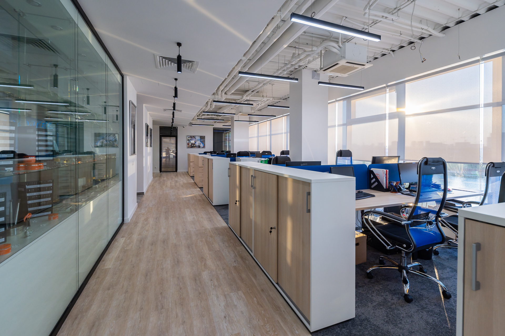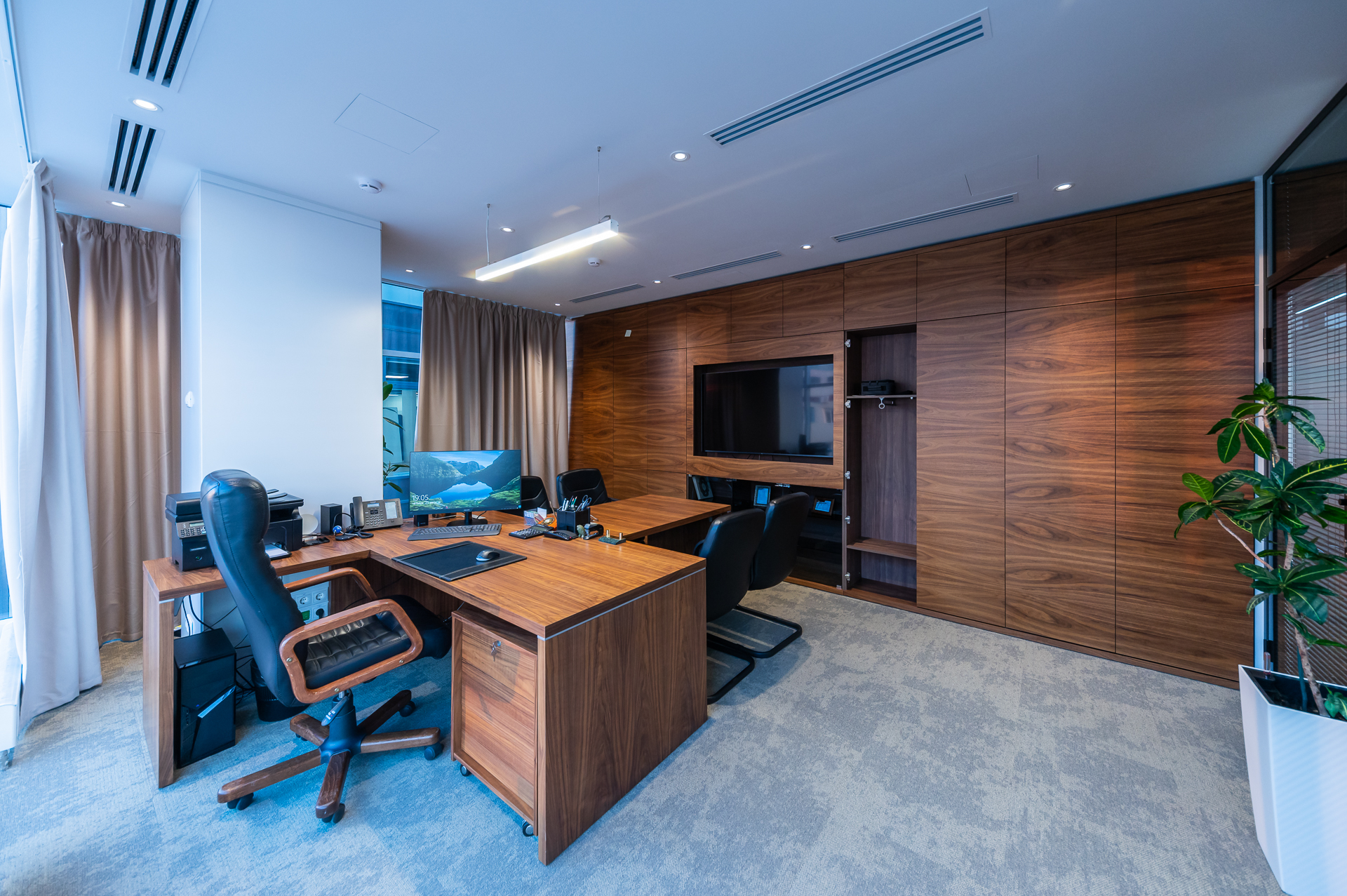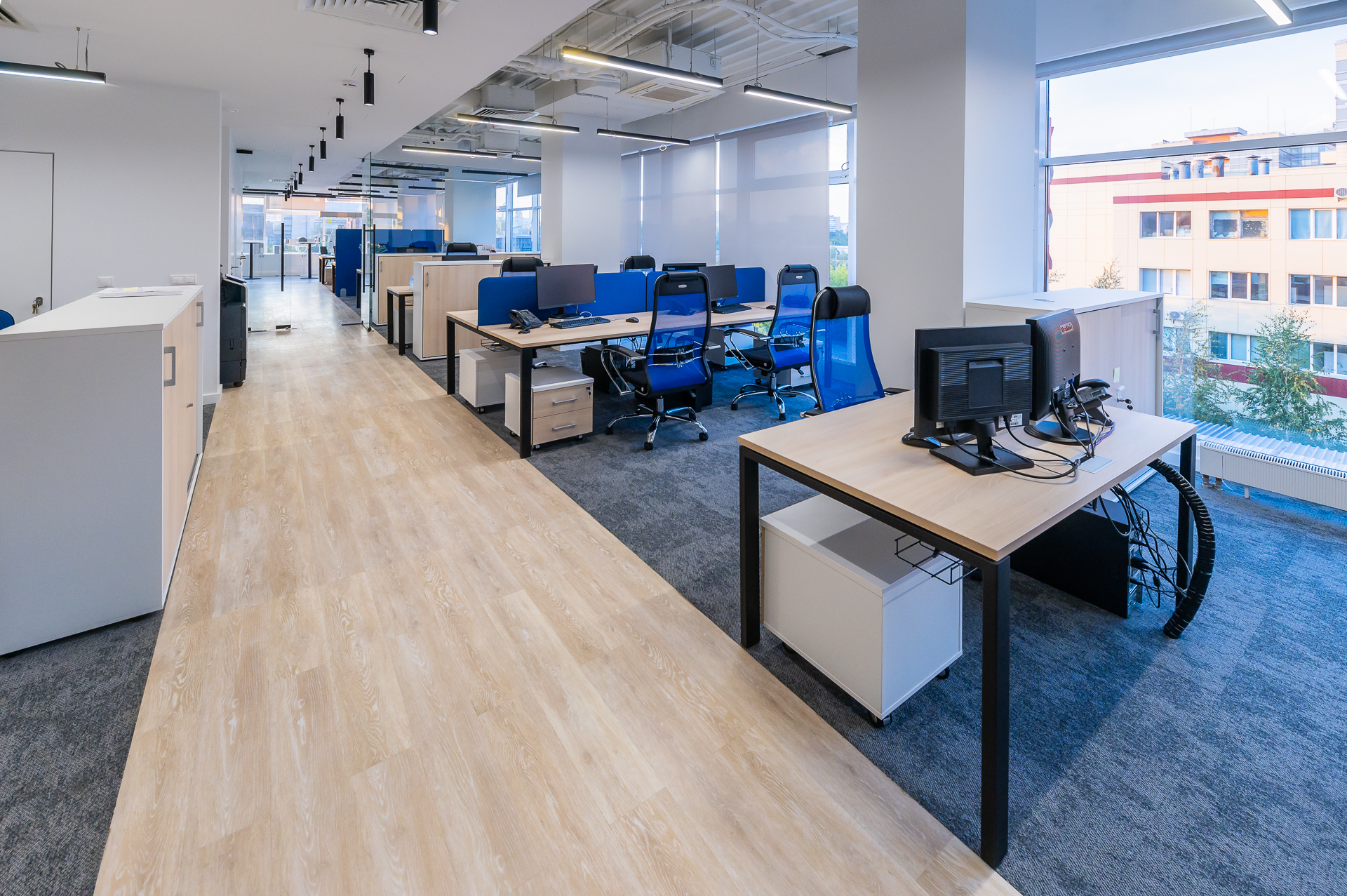 Для оснащения офиса была использована как серийная, так и индивидуальная мебель. Чтобы создать индивидуальное и удобное пространство наши специалисты разработали и производили мебель для кабинетов директоров, переговорных и рабочих зон, мебель и столы для зоны кухни.