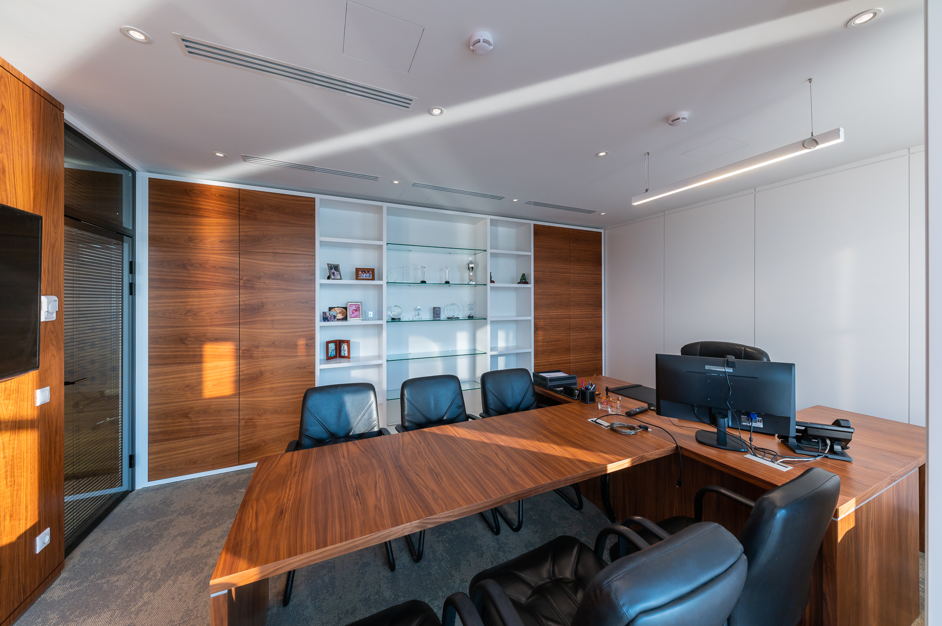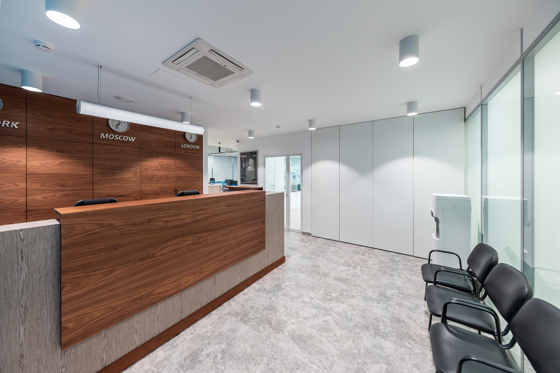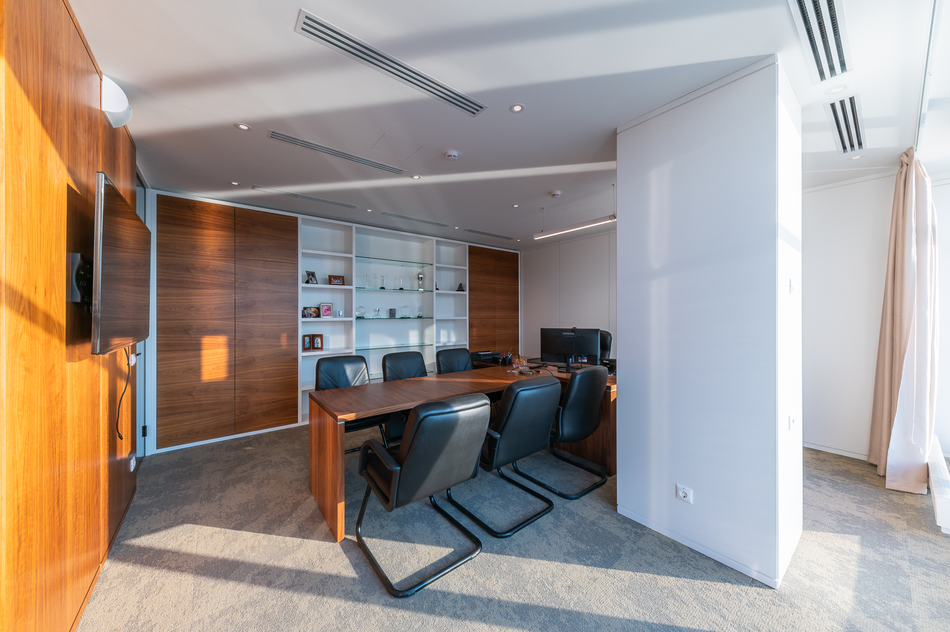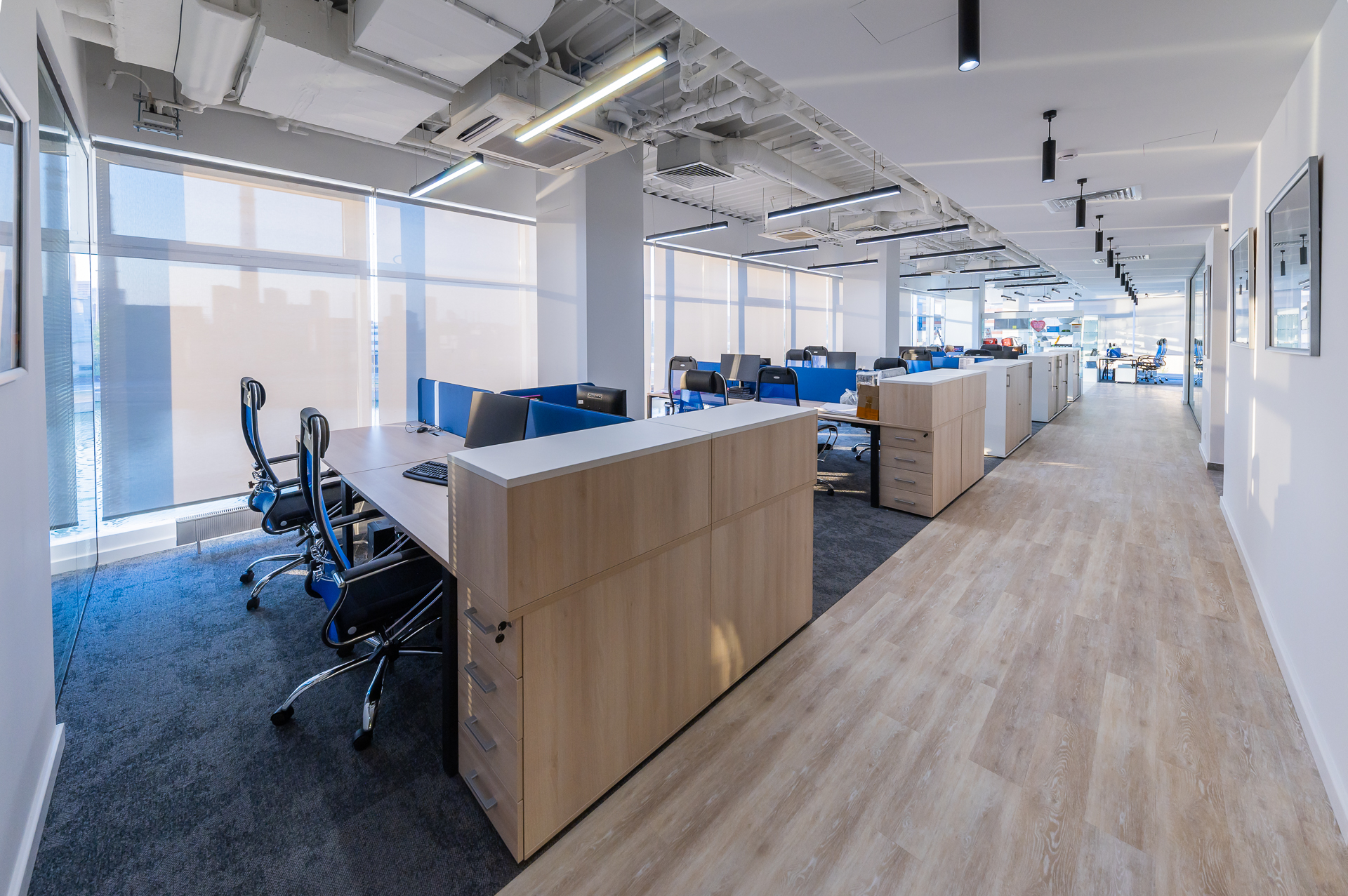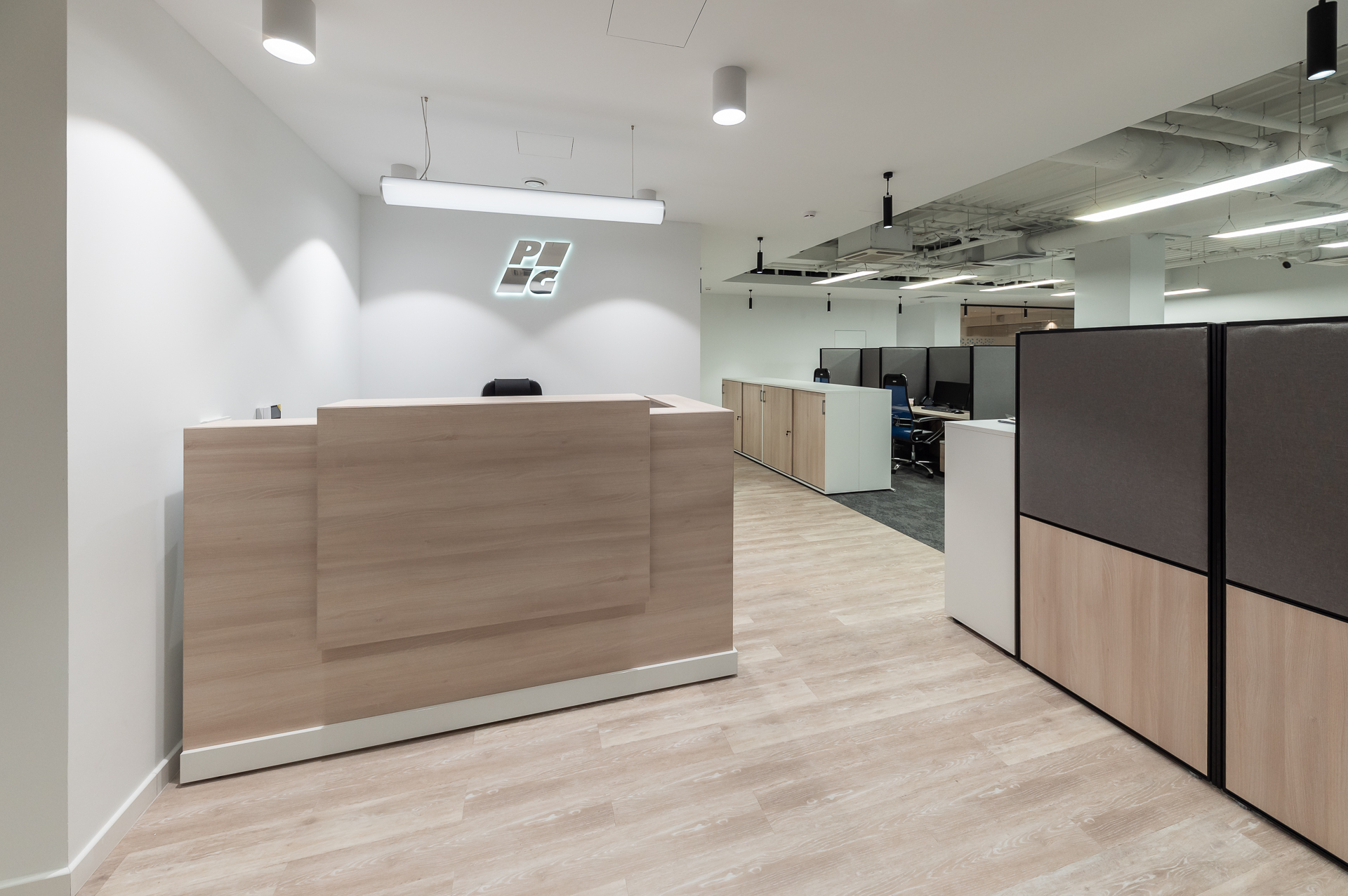 Для оснащения офиса была использована как серийная, так и индивидуальная мебель. Чтобы создать индивидуальное и удобное пространство наши специалисты разработали и производили мебель для кабинетов директоров, переговорных и рабочих зон, мебель и столы для зоны кухни.