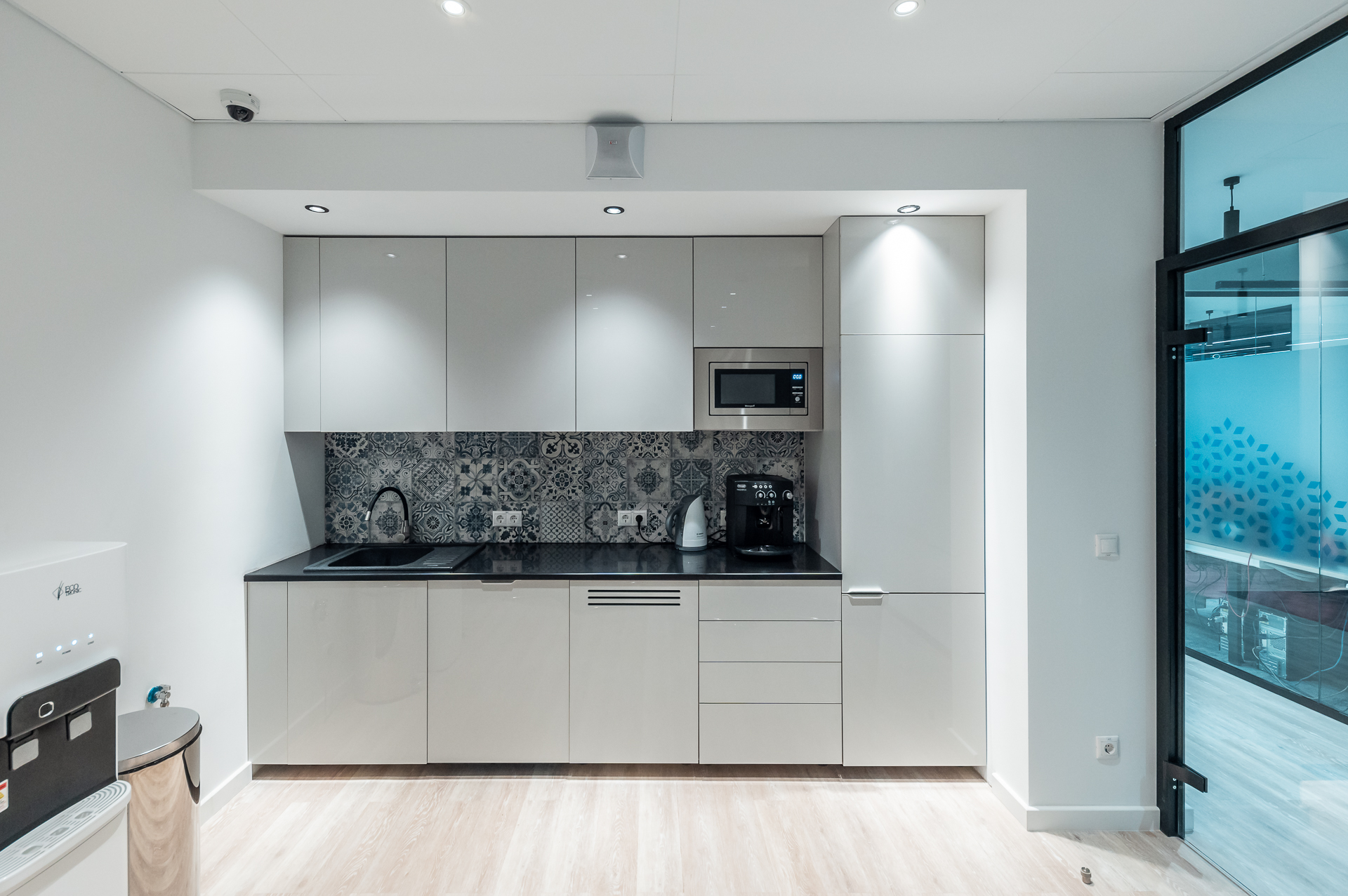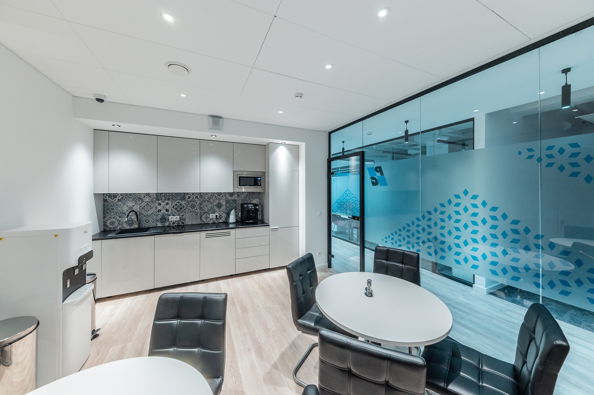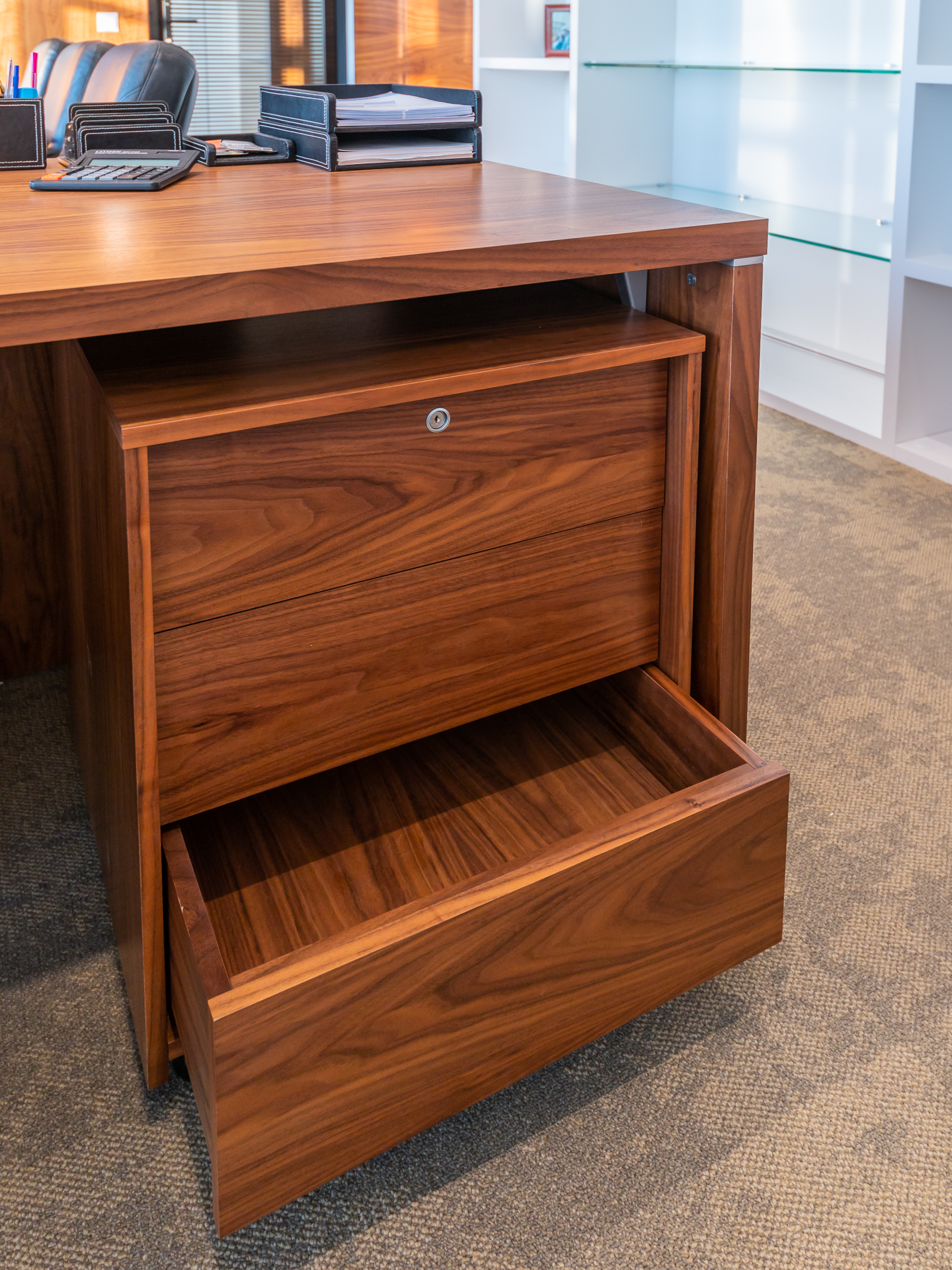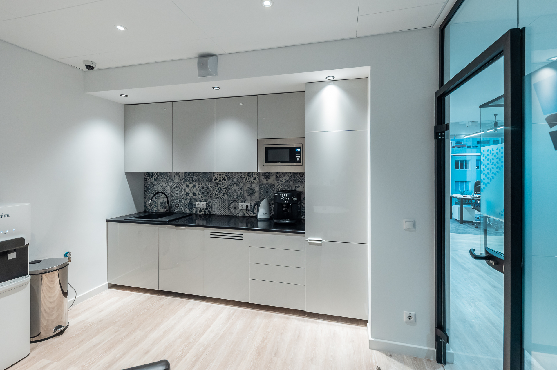 Для оснащения офиса была использована как серийная, так и индивидуальная мебель. Чтобы создать индивидуальное и удобное пространство наши специалисты разработали и производили мебель для кабинетов директоров, переговорных и рабочих зон, мебель и столы для зоны кухни.