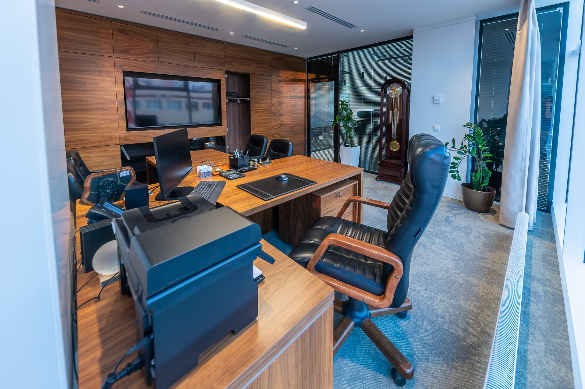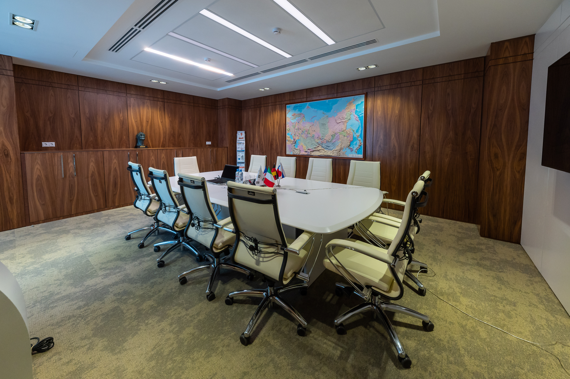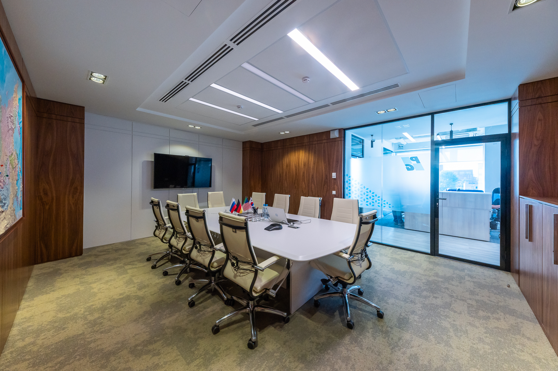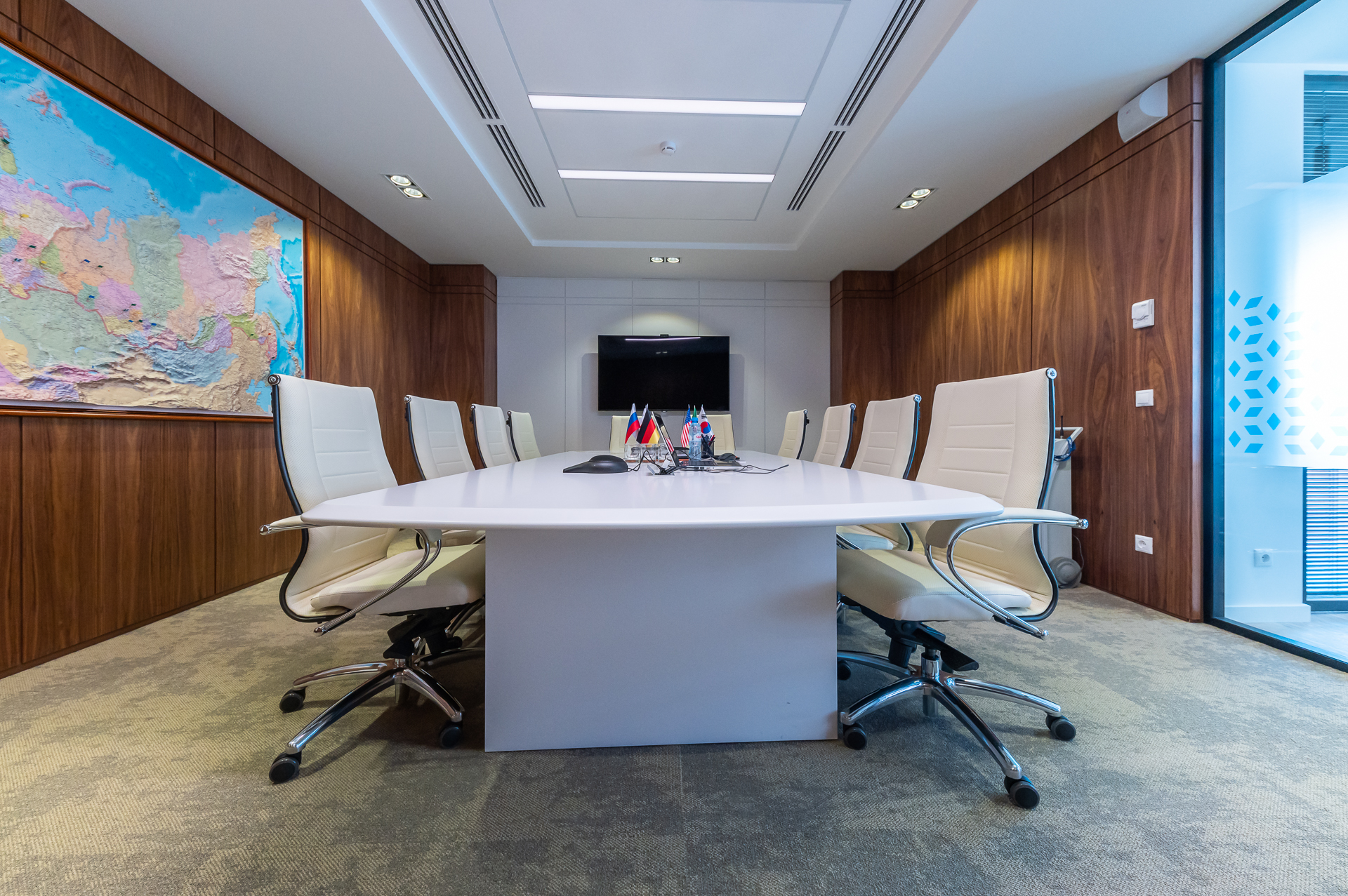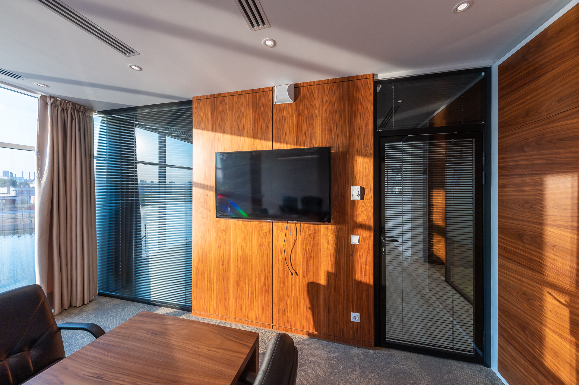 Дизайн офиса предполагал стилевое единство, которое складывалось из различных элементов оформления. Широко использовались окраска и натуральный шпон ценных пор дерева для оформления стеновых панелей и создания мебели.