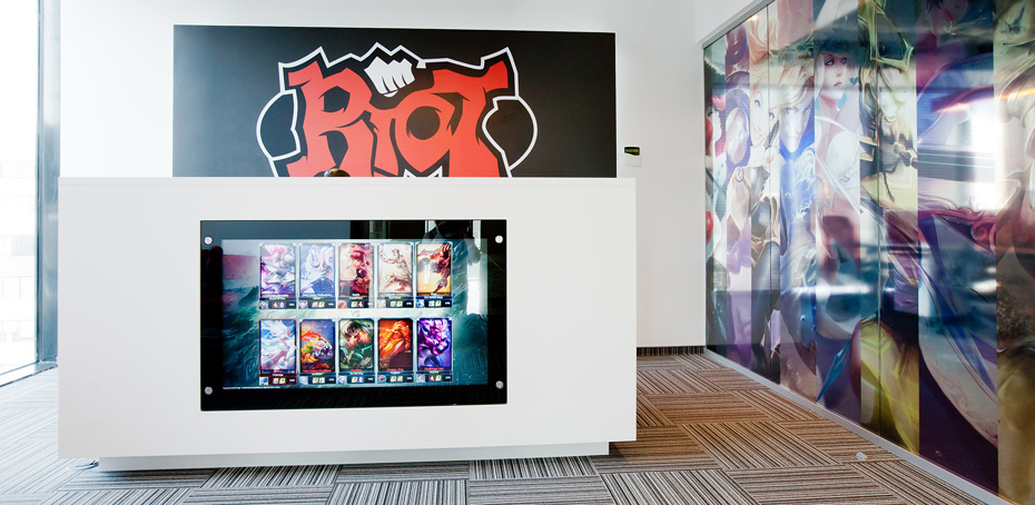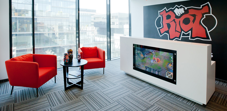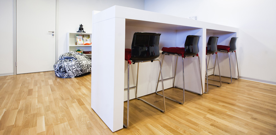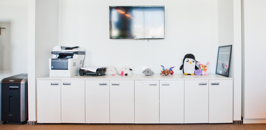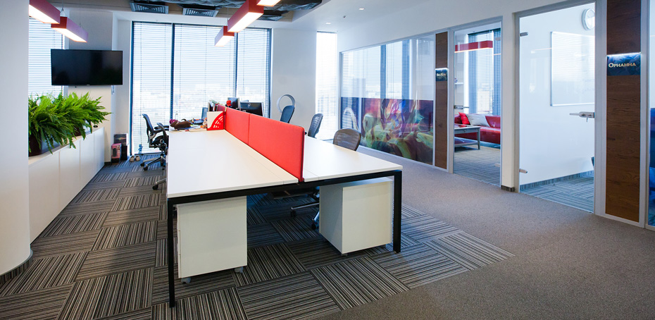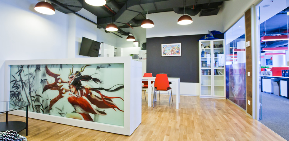 Интересным решением стала белая интерактивная стойка reception со встроенным экраном. На стеклянный фасад барной стойки, расположенной в зоне отдыха, нанесен аниме-рисунок персонажа компьютерной игры разработчика. Для проекта ЛЕПОТА изготовила мебель на заказ в сжатые сроки: стойки, переговорные столы, шкафы, тумбы, рабочие места. Белоснежные бенч-системы с необычным цветом ножек муар оснащены акустическими разделительными экранами, лотками для проводов и удобными тумбами для хранения. |