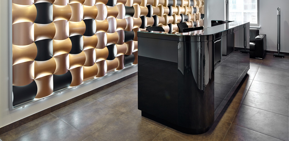 При входе сразу завораживает черная глянцевая стойка рецепции. Конструкция, изготовленная на фабрике ЛЕПОТА, выполнена из окрашенного стекла с вставками моллированного (изогнутого) стекла