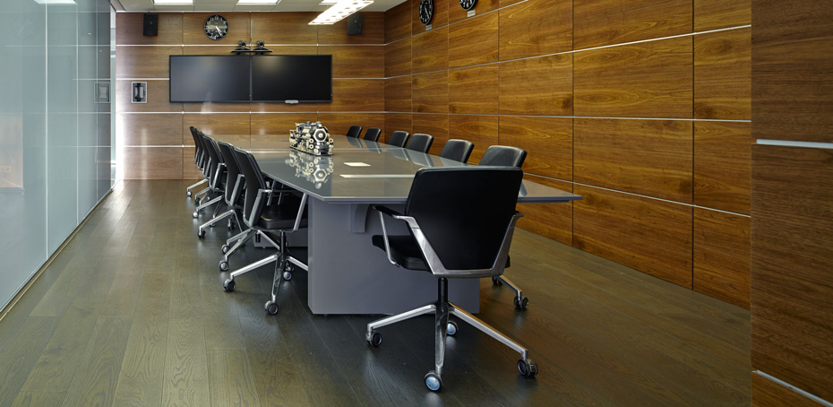 Панели из шпона натурального ореха лаконичны, но с богатой текстурой, подчеркивают респектабельность компании и помогают создать продуктивную деловую атмосферу.