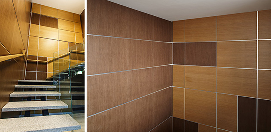 На одной из стен в холле, к которой примыкает лестница, шпонированные панели образуют минималистичное декоративное панно. Его особенность заключается в том, что панели разных цветов расположены в разных плоскостях.