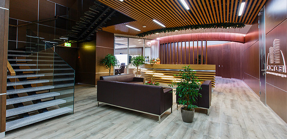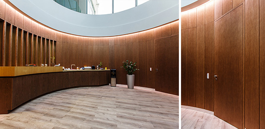 Отделка стен круглого холла выполнена из сегментов шпонированных панелей. Примыкающая к холлу стойка рецепции повторяет его радиальную форму. Она так же отделана шпонированными панелями, но, в этом случае, изогнутыми по дуге.