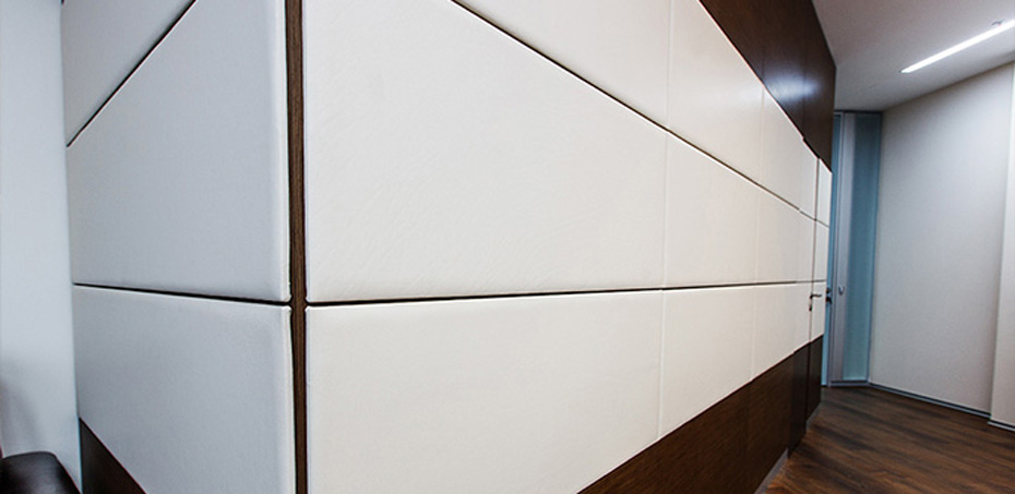 Зона дирекции получилась строгая и представительная. Стены в холле и кабинетах облицованы шпонированными панелями, кроме того в кабинетах есть вставки с панелями из светлой кожи.