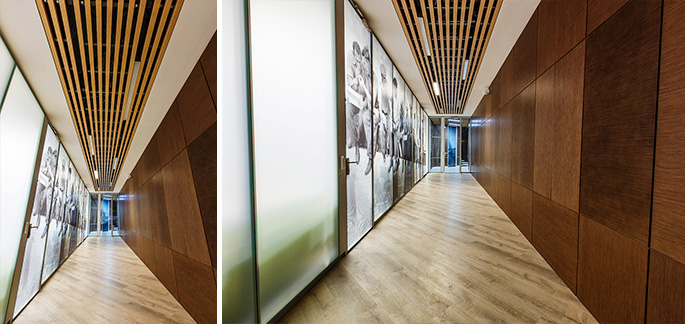 Подвесной потолок в вестибюле и частично в кабинетах выполнен из решетчатых панелей, изготовленных по индивидуальным размерам, с учетом размеров светильников. Благодаря их воздухопроницаемости, все вентиляционные решетки можно спрятать за потолком. ЛЕПОТА также изготовила и установила панели, закрывающие технические устройства. Панели декоративной фальшстены выполнены из натурального шпона в двух цветовых решениях.